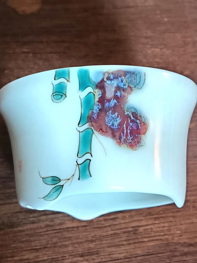 Ce filtre en porcelaine blanche est accompagné de son support peint représentant une canne de bambou et un papillon.